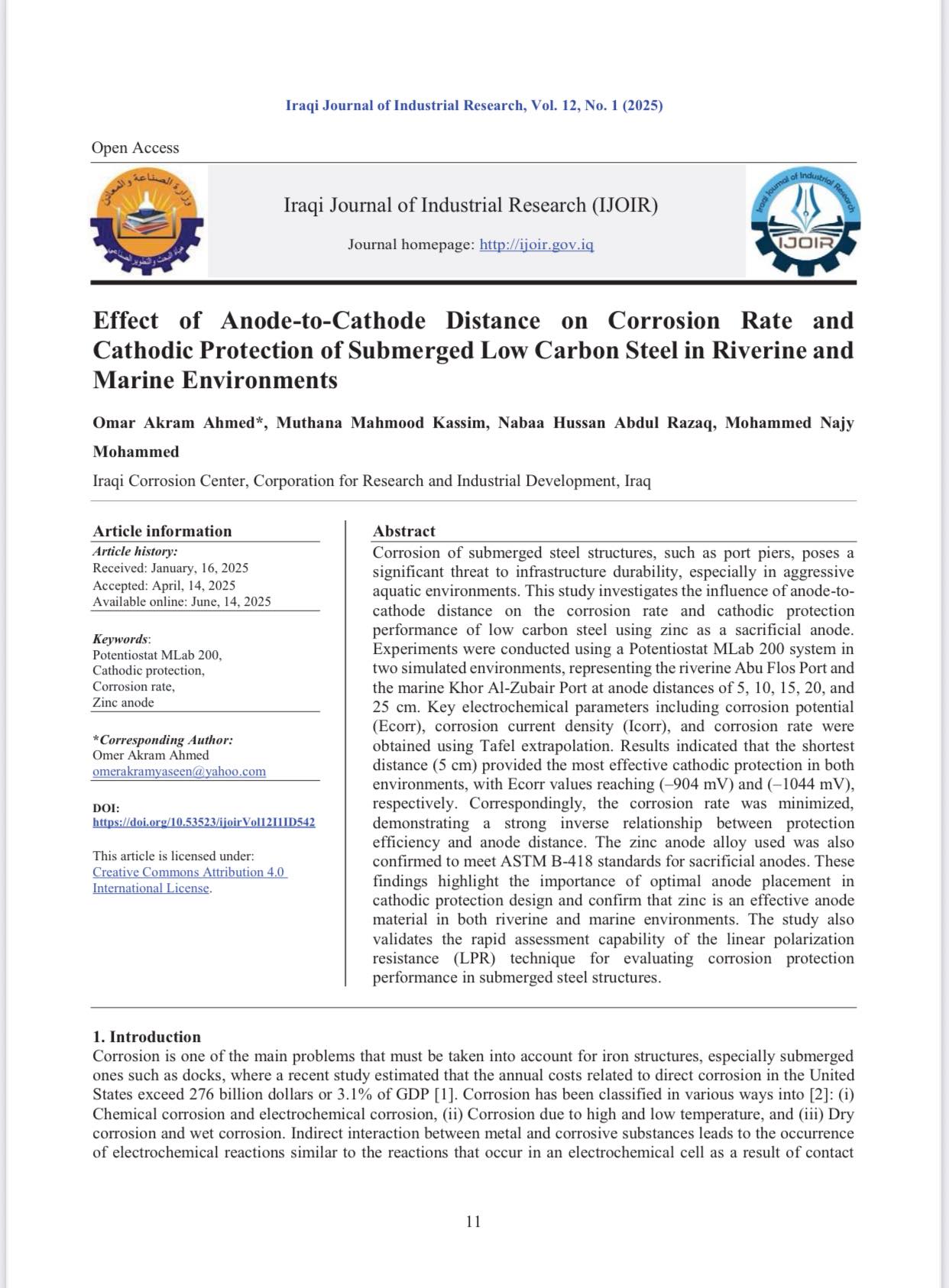 تمكن المركز العراقي للتأكل من نشر بحث علمي بعنوان: “Effect of Anode-to-Cathode Distance on Corrosion Rate and Cathodic Protection...