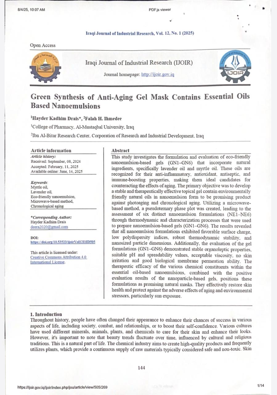 مركز بحوث ابن البيطار ينشر بحث علمي تطبيقي في المجلة العراقية للبحوث الصناعية